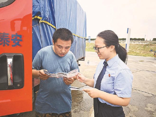 今年9月,湖北省宜城市检察院检察官走进辖区高速服务区,向货车司机发放普法宣传手册。
